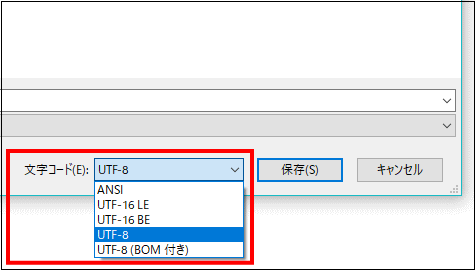 |   Windows 10 に付属のメモ帳では,テキストを保存する時に文字符号化方式を指定できます.下図は [ファイル] [名前を付けて保存] で現われる保存ダイアログの右下の部分です.[文字コード] が文字符号化方式の設定です.デフォルトは UTF-8 です.  |