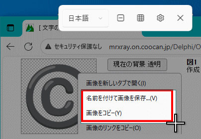 | 画像のコピー、保存の方法です。マウスの右ボタンクリックのメニューから [名前を付けて画像を保存] または [画像をコピー] を選択します。 |