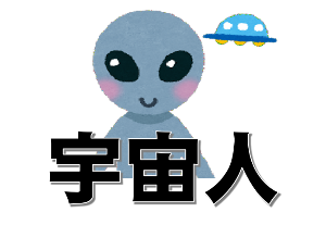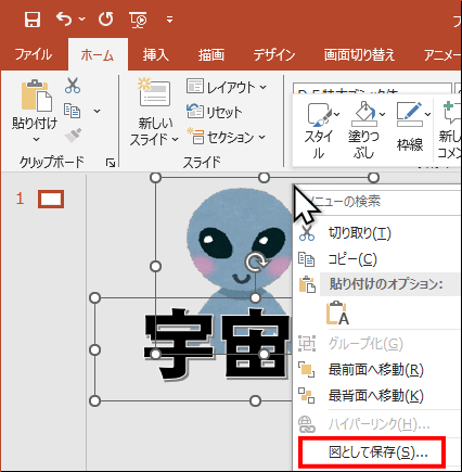 背景が透明な PNG 画像を配置しているスライドに、テキストボックスを挿入して「宇宙人」というテキストを入力しています。Power Point では袋文字などの装飾文字にすることができますから、少しだけ手を加えてみました。Power Point でば選択した複数のオブジェクトを 1 つの画像にしして保存できます。下図では、画像とテキストボックスを選択しています。その状態でマウスの右ボタンをクリックして [図として保存] を選択します。