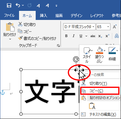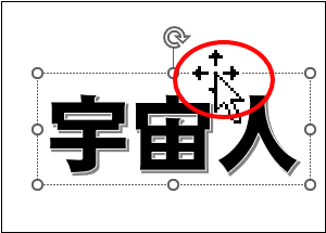 ワードアートを選択して、マウスカーソルを枠線に移動すると下図のようになります。これは、オブジェクトを移動する時のマウスカーソルの状態です。この状態でマウスの右ボタンをクリックしてメニューを表示します。そして [コピー] を選択します。