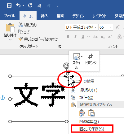 テキストボックスだけを画像として保存する場合は、テキストボックスを移動のためな選択した様態、マウスカーソルが下図の状態の時にマウスの右ボタンをクリックしてメニューを表示します。テキストボックス内で表示したメニューには [図として保存] の項目はありません。