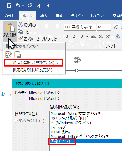 [貼り付け] をクリックして [形式を選択して貼り付け] を選択して現れるダイアログで [画像 (SVG)] を選択します。 |