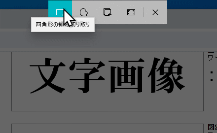 [Win] + [Shift] + [S] のキー操作で起動すると、画面上部中央に小さなウィンドウが現れ、ディスプレイ画面全体が半透明のグレーになります。[四角形の領域切り取り] をクリックして、マウスドラッグでキャプチャする範囲を選択します。選択範囲は透けて見えるようになります。ディスプレイ画面のどの部分でもキャプチャできます。